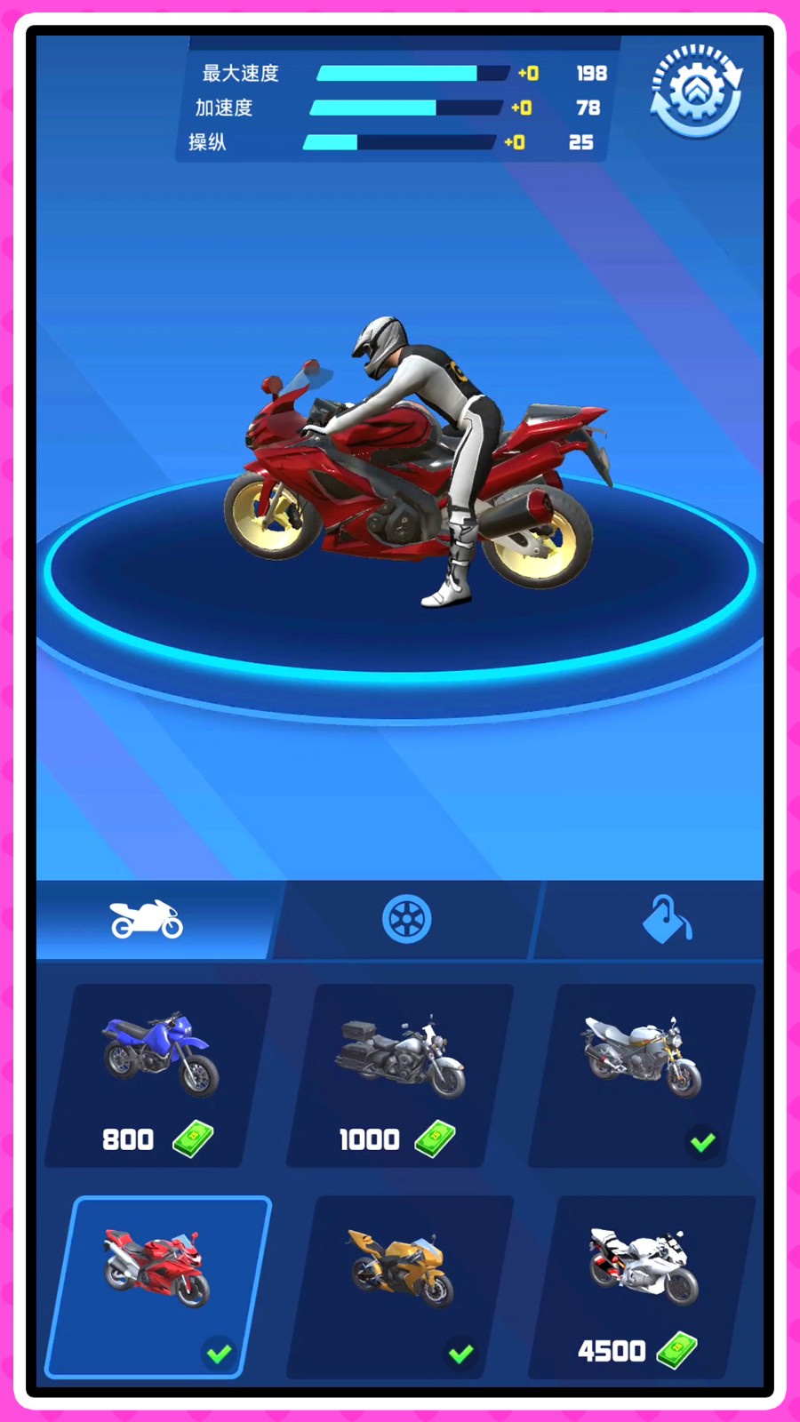 2、你应该经常改装你的自行车,这可以提高你的漂流或特技技能,有很多类型的自行车供玩家选择。