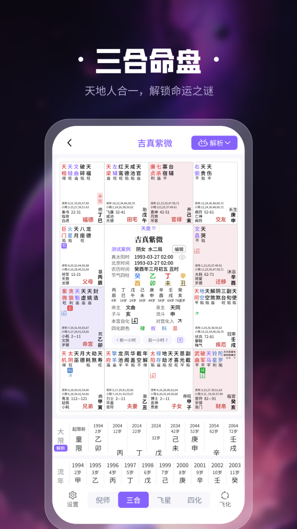 1.多种命盘类型:我们提供了三种命盘类型,包括飞星盘、三合盘和四化盘。我们深入研究了典籍,经过严格的数据校对,以满足不同流派对于命盘解读的各种需求。